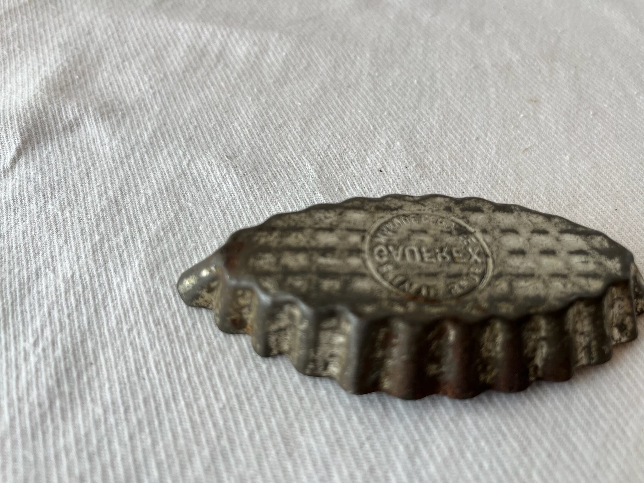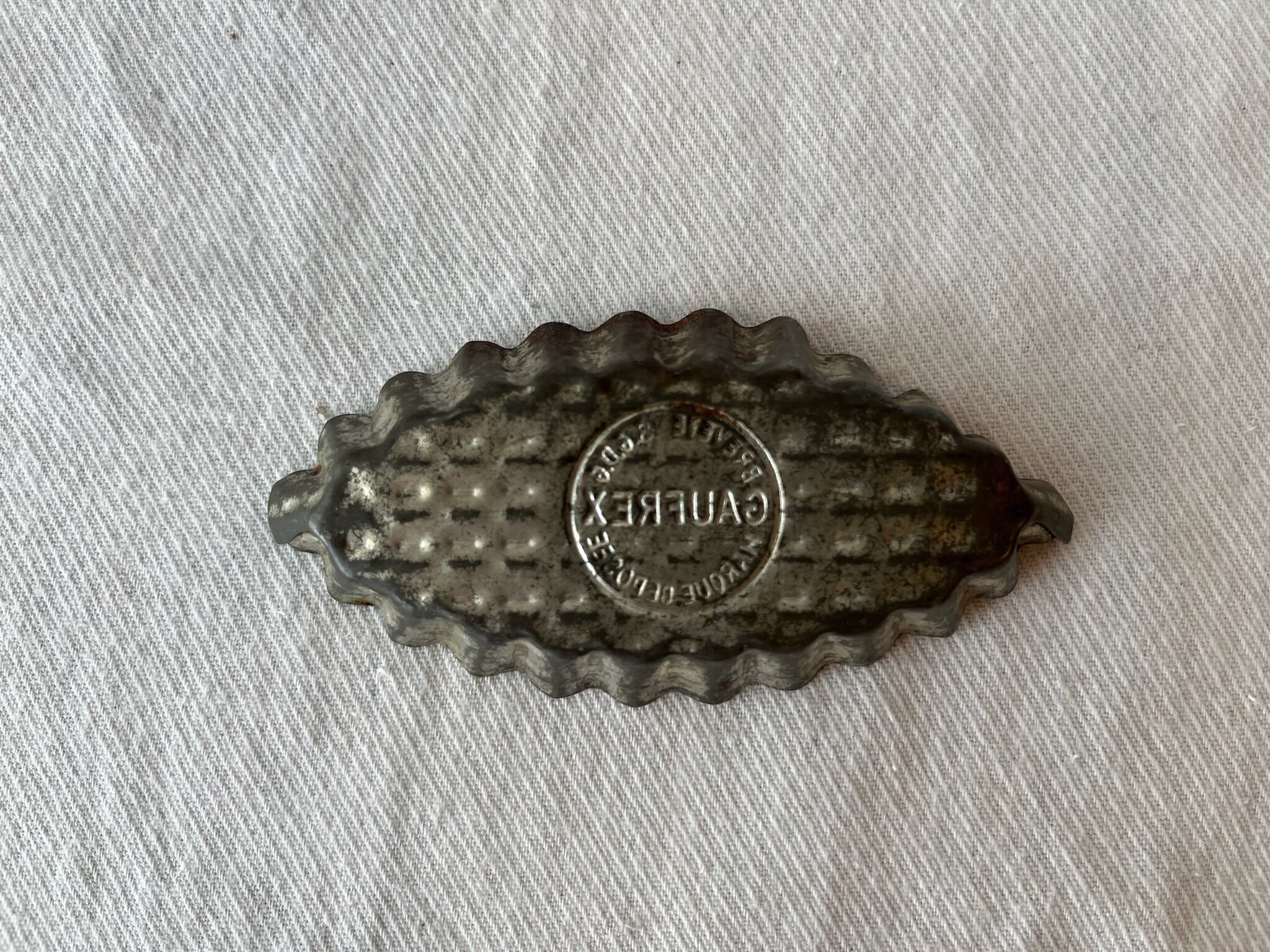 フランスの老舗メーカー「GAUFREX(ゴーフレックス)」製のヴィンテージミニ菓子型です。オーバルの舟形で、縁には美しいフルーテッド(波型)模様が施されています。